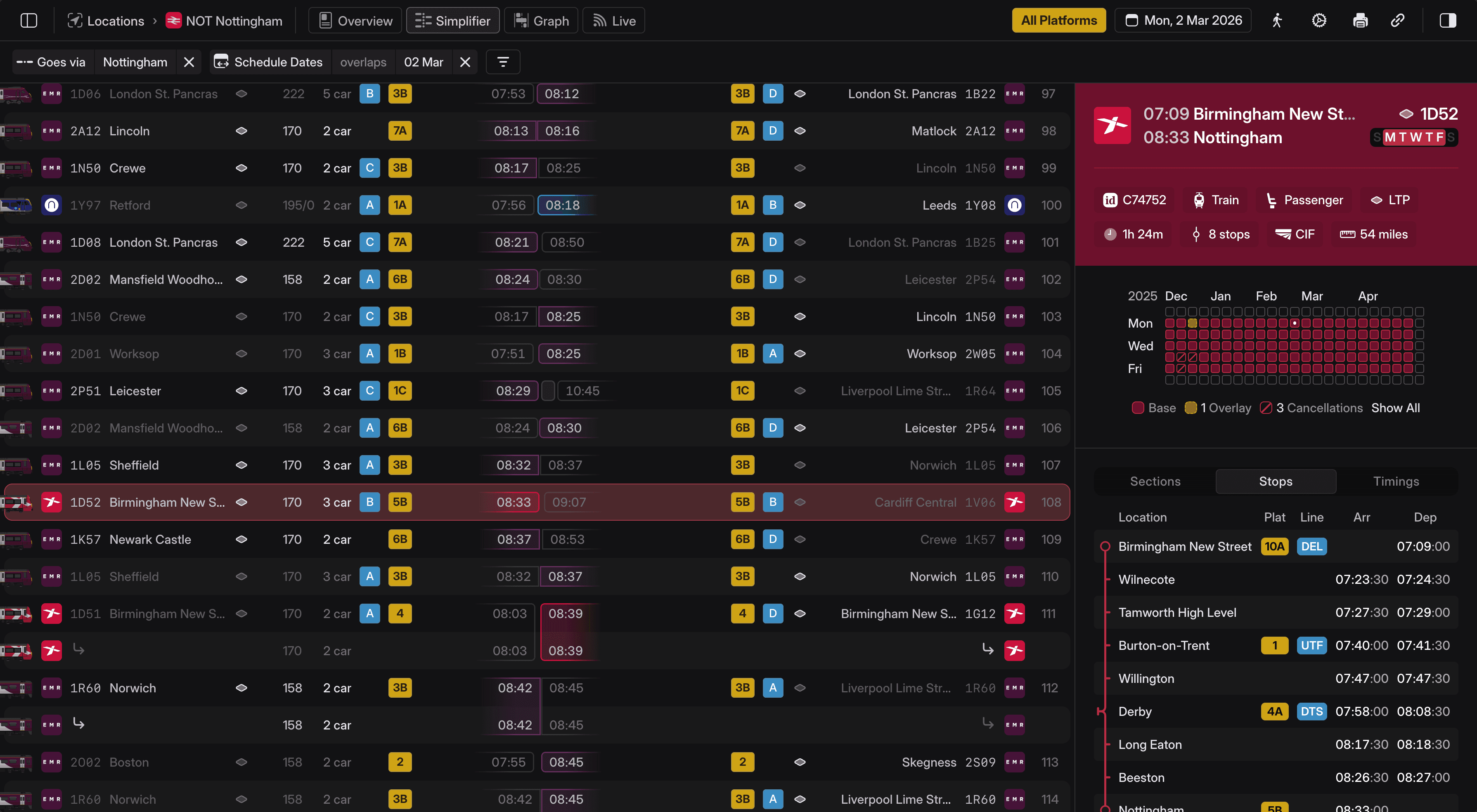 Access an always-up-to-date simplifier of your station operations, with the complete picture of vehicle and crew diagrams providing oversight of the entire operation. Easily generate printed simplifiers or access data online, including live reporting. Plus, check the plan for conflicts in advance, with a to-scale platform graph that identifies clashes, platform mismatches and platform length issues up front.